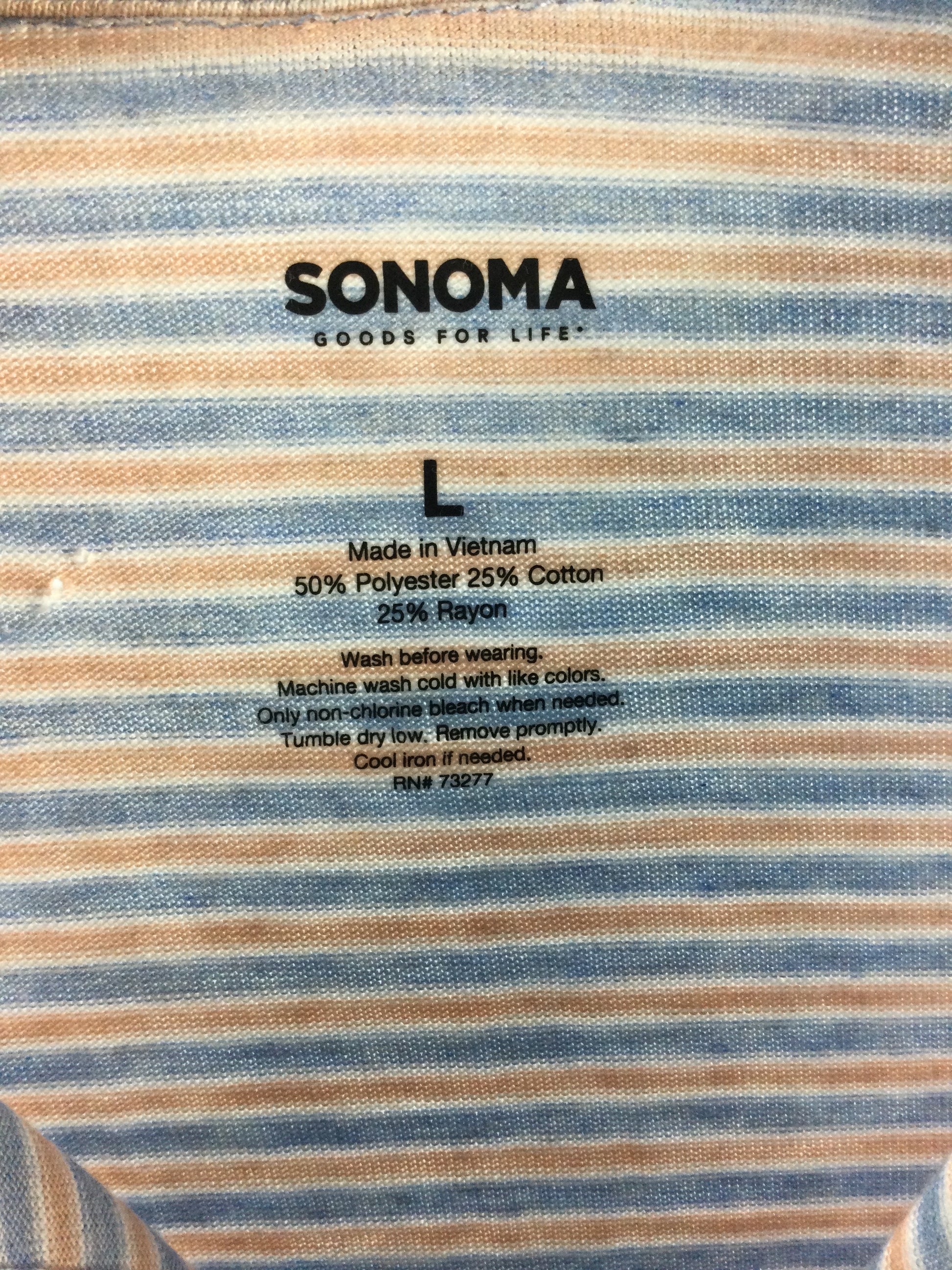 light blue, tan, & white stripes, short sleeve, lightweight soft knit-- perfect for your summer golf match