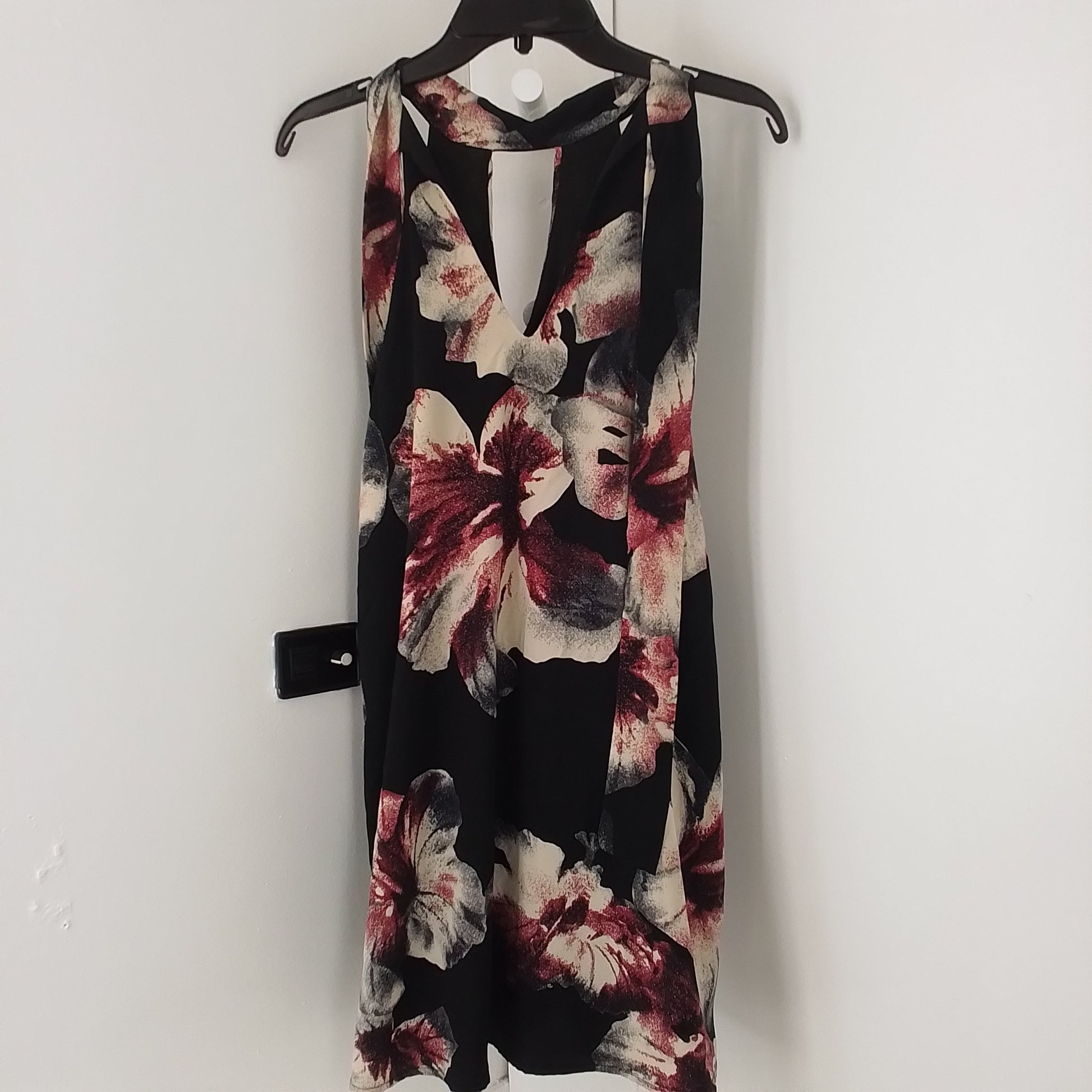 New with tag, this black sleeveless dress previously sold at a boutique for $39. It is a pull-over without fasteners, A-line design & above the knee length. It features a v in front as well as in the back, and a fabric tie at the neck.