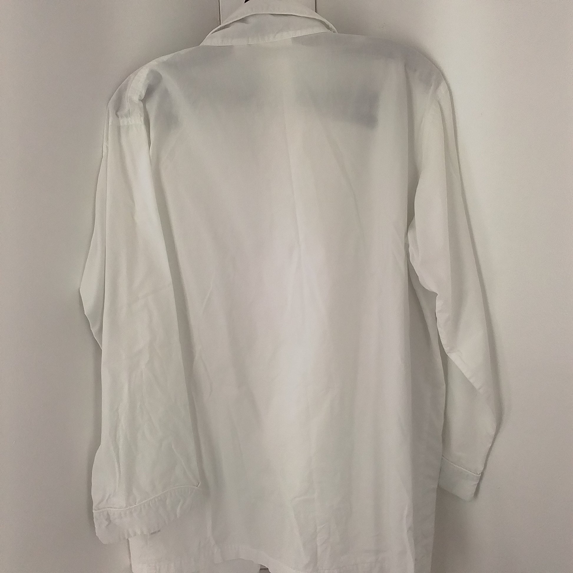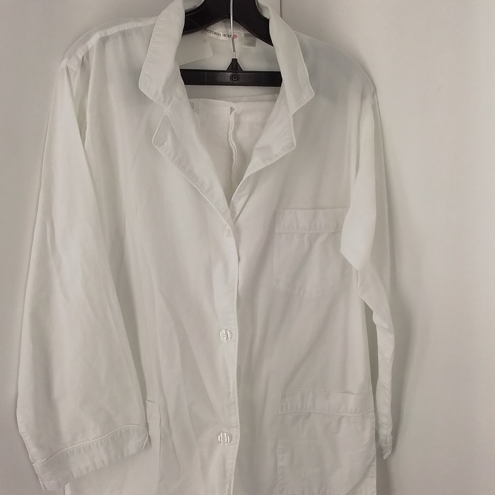 Cozy up in this 2-piece scrub-style white pj set in 100% cotton. It consists of a long sleeve top with buttons and pockets, paired with pants that tie at the waist.
