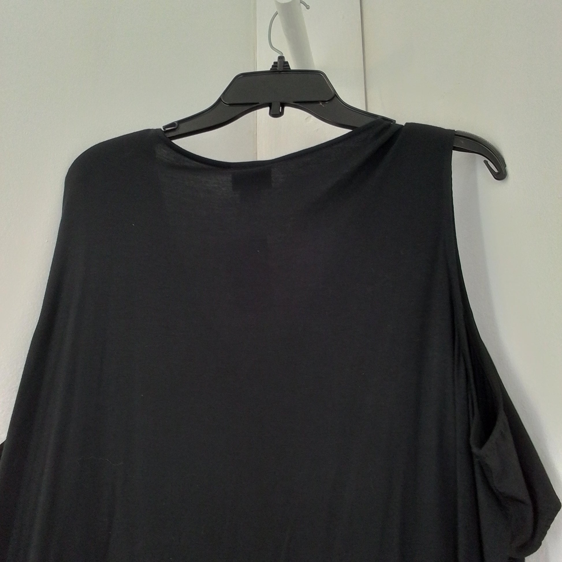 Gently Used Women's Black Rayon Blouse, 2x size, features sleeveless, ruffle v-neck for standout summer style. Summer-ready design with lightweight, breathable fabric—perfect for effortless, chic looks.