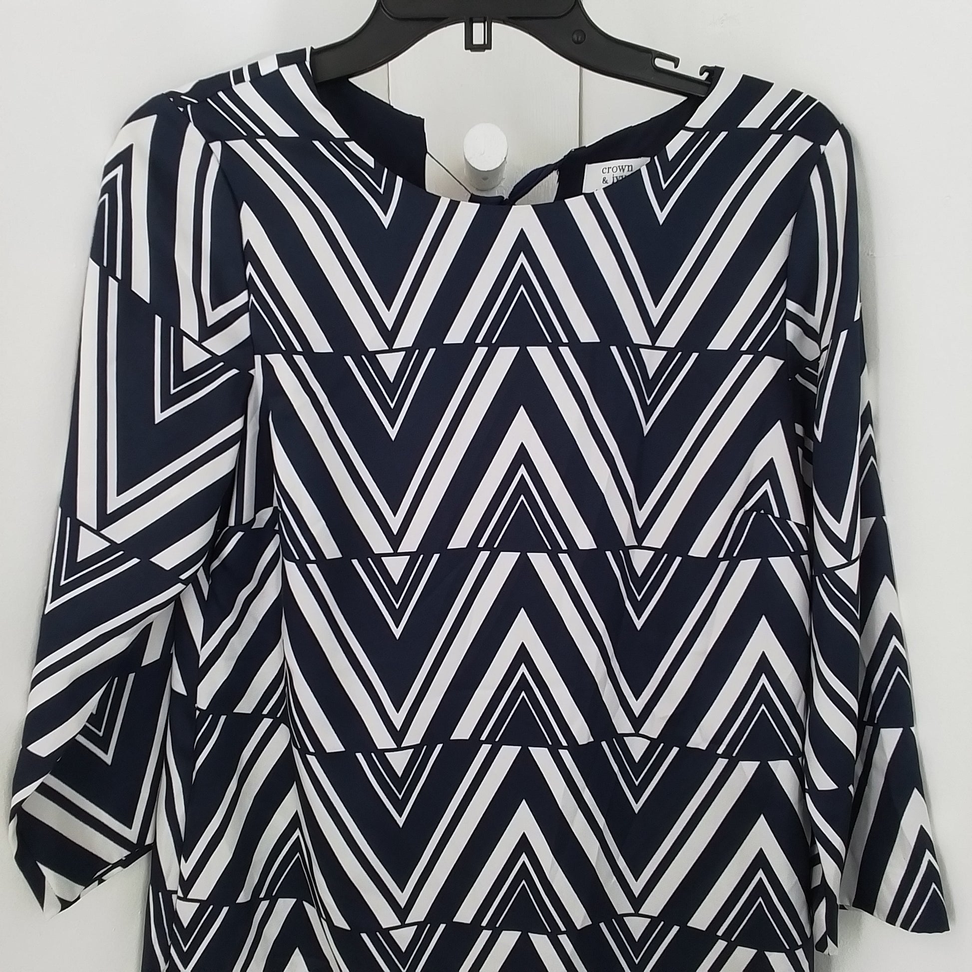 Crown & Ivy Women's Dress in gently used condition, featuring white and navy colors with long sleeves and a repairable fabric tie for standout style. Vacation-ready polyester piece perfect for effortless, breezy looks.