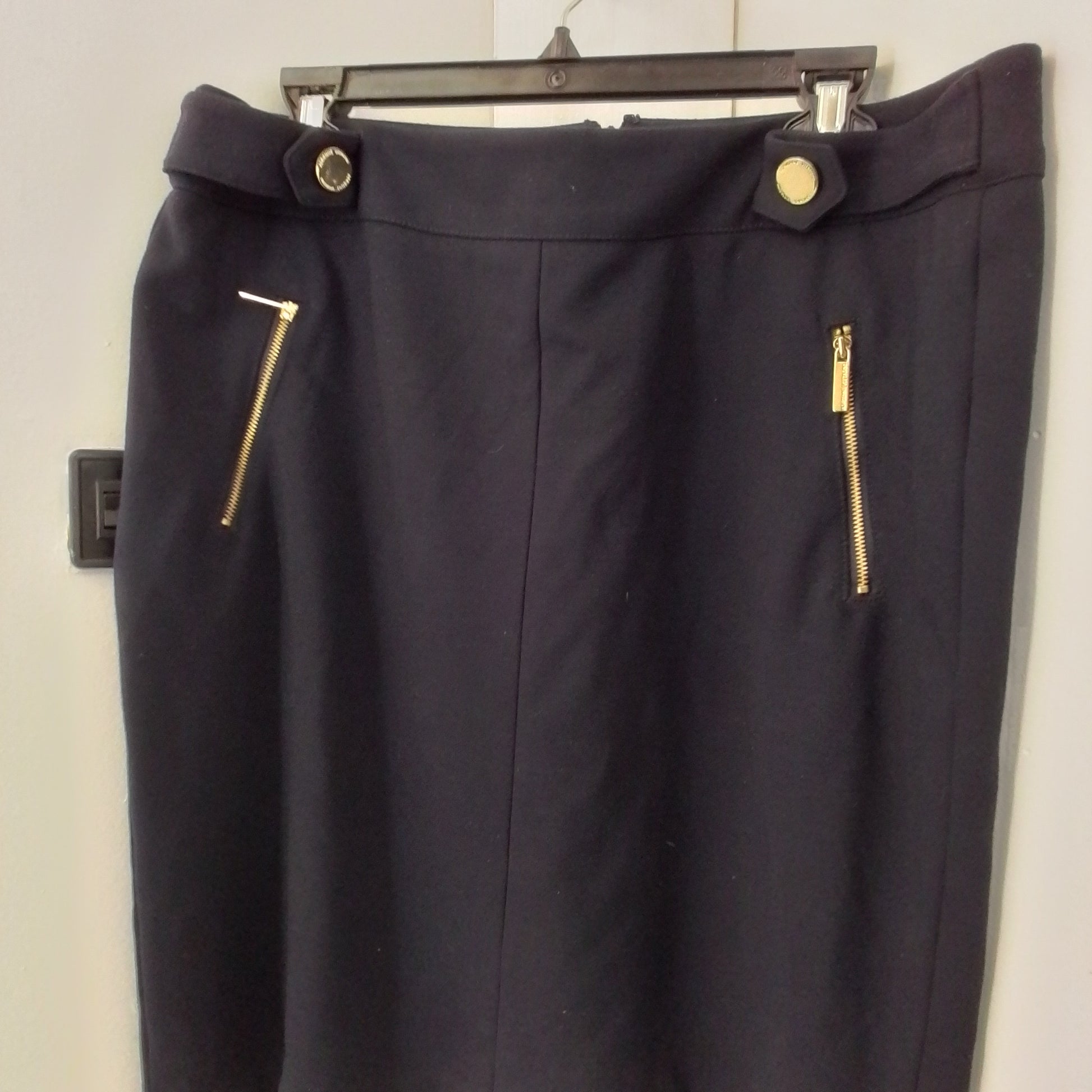 Business-ready Women's skirt in gently used condition, size 14, classic black, with a zip-back for easy wear. Premium blend of polyester, rayon, and spandex delivers comfort and style for standout professional looks.